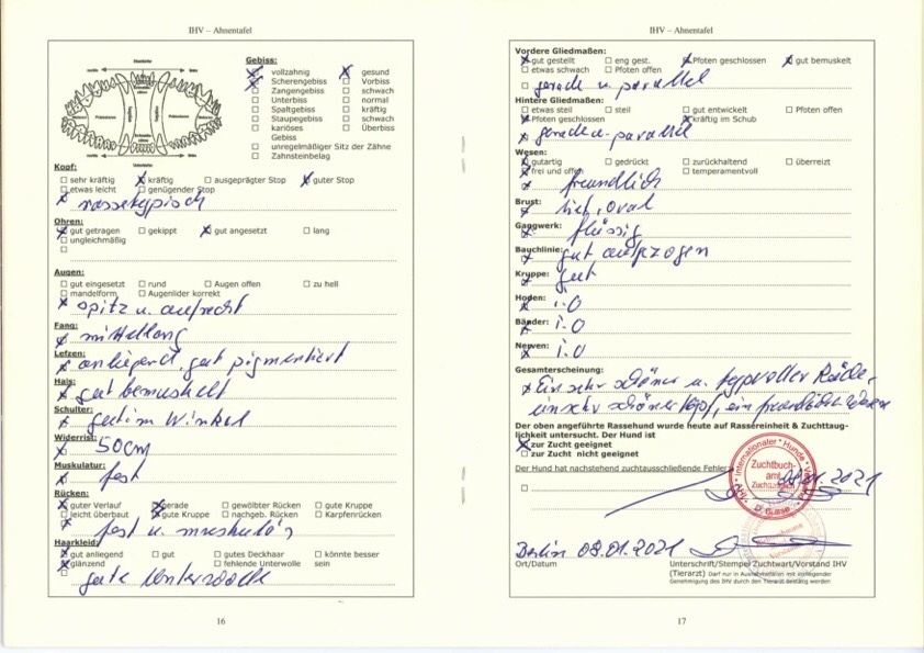Bandit’s Zuchttauglichkeitsprüfung nahm Dietmar Busse (Zuchtwart und Vorstandsmitglied des IHV) im Januar 2021 ab. Bewertung: