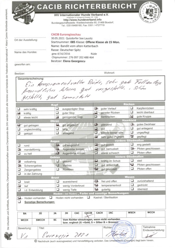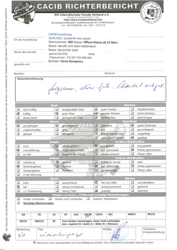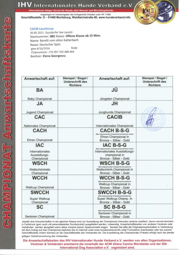 Bandit hat 2021 seine Zuchtzulassung im IHV erhalten und auf seiner ersten Ausstellung zwei Anwartschaften auf CACIB (Internationales Championat) erworben.